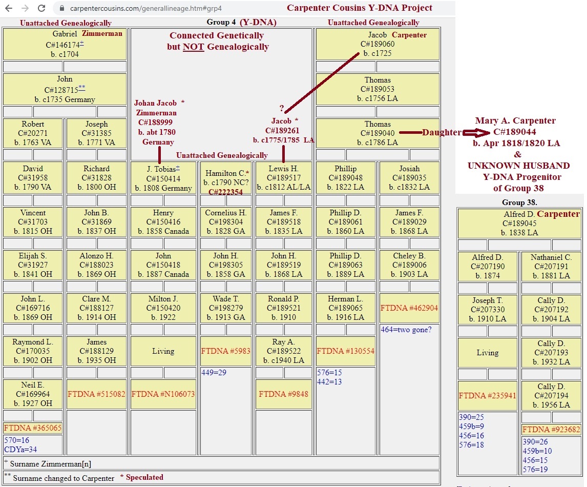 This next image is adapted from the The Carpenter Cousins Y-DNA Project lineage page. This is showing Group 4 and how Group 38 is related genealogically.
